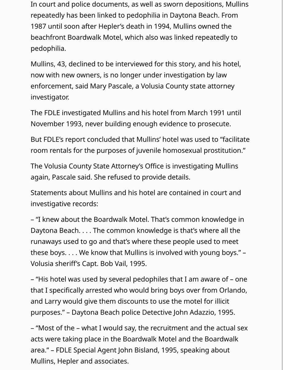 – “I knew about the Boardwalk Motel. That’s common knowledge in Daytona Beach. . . . The common knowledge is that’s where all the runaways used to go and that’s where these people used to meet these boys. . . . We know that Mullins is involved with young boys.” – Volusia sheriff’s Capt. Bob Vail, 1995.