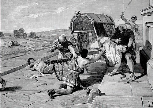 He faced death with dignity, baring his neck to the sword. His head and hands were displayed in the Forum.