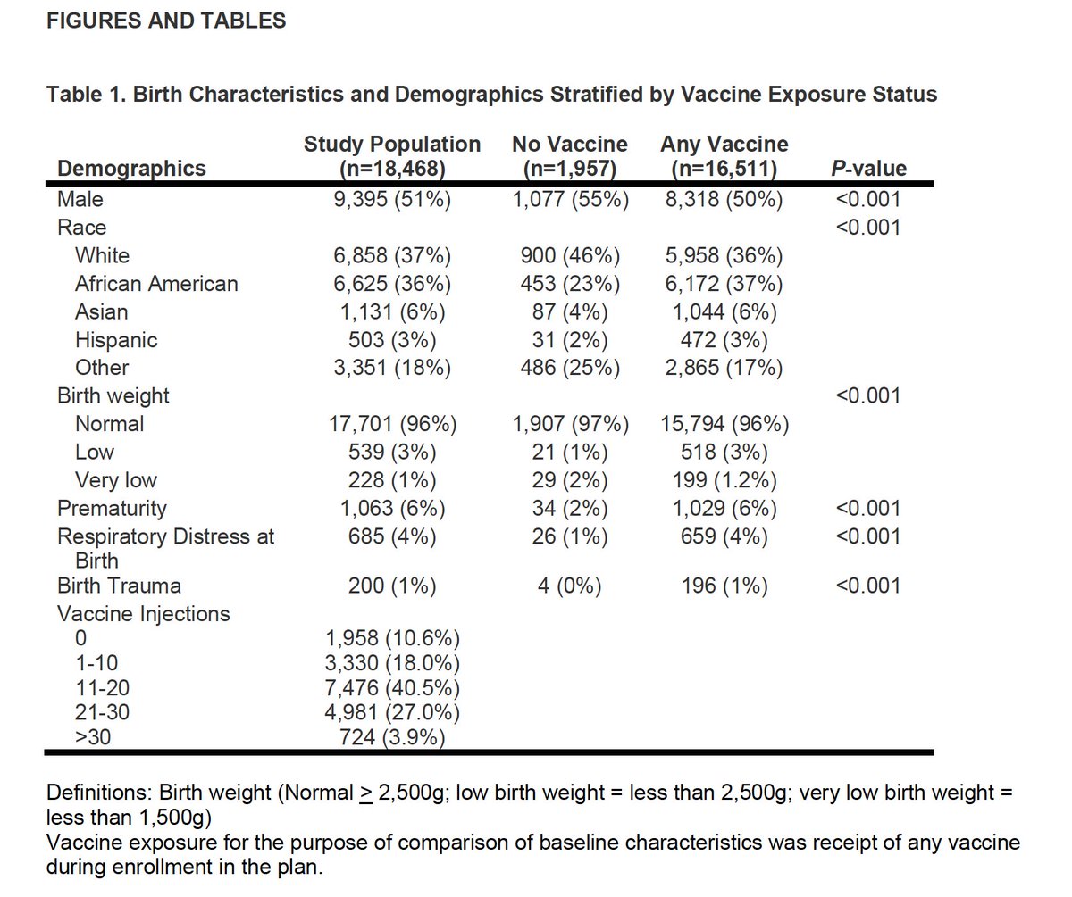 Key concern #1: non-comparable groups. The never-vaccinated are a small, atypical subset, making causal contrasts difficult. In the baseline table, every characteristic differs (P < 0.0001): sex, race, birthweight, prematurity, respiratory distress at birth, and birth trauma.
