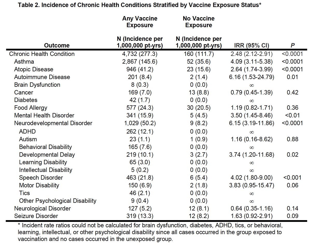 Key Results (as reported). Compared with never-vaccinated, vaccinated children show higher incidence for chronic conditions 2.5×, and for specific categories asthma 4.3×, atopic disease 3.0×, autoimmune 6.0×, chronic ear infection 5.7x and anaphylaxis 8.9x.