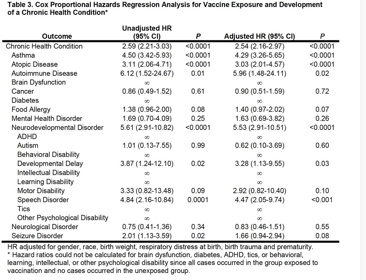Reported results. The overall rate of “any selected chronic disease” was about 2.5× higher in vaccinated children. For various individual or grouped outcomes, many estimates were statistically significant and fell in the 3.0–6.0×range, leading the authors to conclude that “vaccine exposure in children was associated with increased risk of developing a chronic health disorder.”