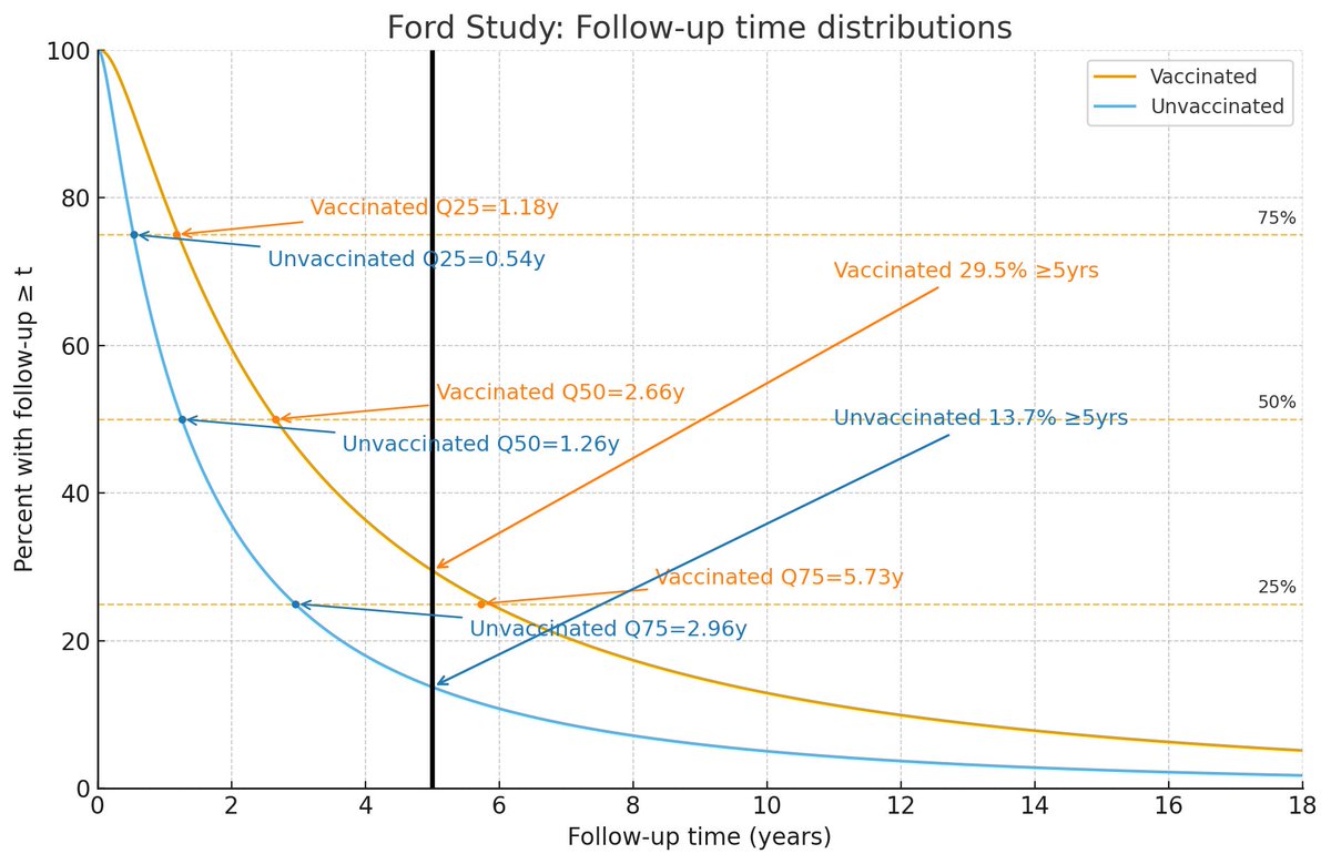Follow-up as indicated by paper: median 2.7 y (970 d) in vaccinated vs 1.3 y (461 d) in unvaccinated. IQR 1.3–5.7 y (430–2,093 d) for vaccinated vs 0.5–3.0 y (196–1,081 d) for unvaccinated.