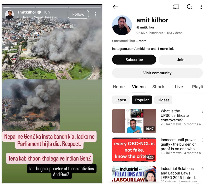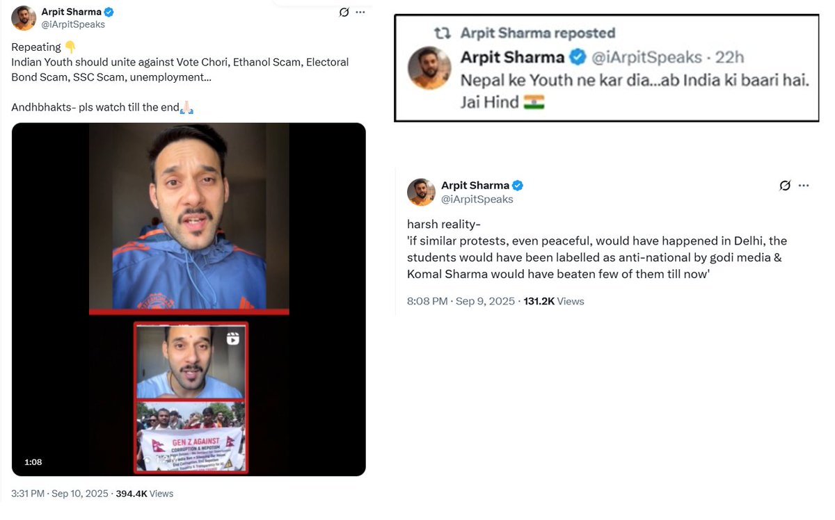 Content creators like Arpit Sharma (son of AAP leader Vikas Sharma) posted videos explicitly calling for Indian youth to "replicate what Nepal's youth did." UPSC Educator Amit Kilhor posted a similar story.