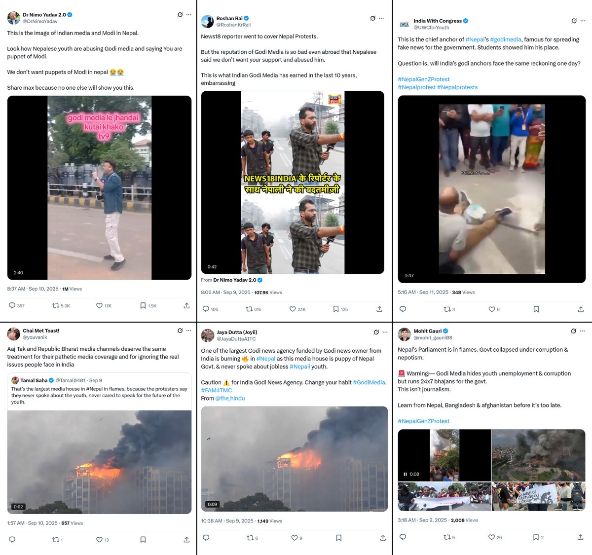 @Zoo_bear, @PunsterX, @DrNimoYadav, and other pro-opposition (Congress, AAP) handles shared footage of Nepal's largest media house burned down, suggesting Indian "Godi media" deserves similar treatment.