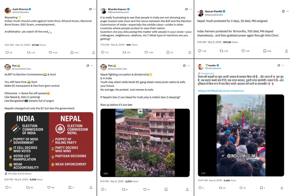 Following the recent Gen Z–led protests in Nepal, opposition-linked social media handles in India, notably from Congress & AAP, began invoking the “Nepal template,” amplifying youth-led dissent as a playbook for stirring mass civil unrest in India.