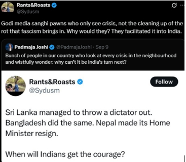 Lastly, these aren't organic expressions of solidarity with Nepal. They're coordinated attempts to use foreign political instability as a blueprint for domestic disruption and capitalize on the unrest. The messaging is too consistent, too strategic, too targeted.