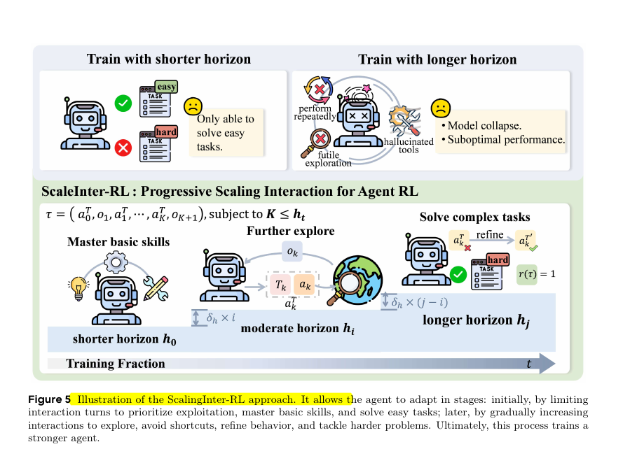 ScalingInter-RL solves this by gradually increasing the number of interaction steps during training. At first, the agent works with short horizons to master the basics and build reliable skills.