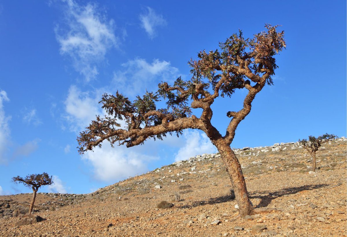 This squat little tree is found in dry, dramatic places like Oman, Ethiopia, and Somalia. The tree oozes a resin when cut, like sap.