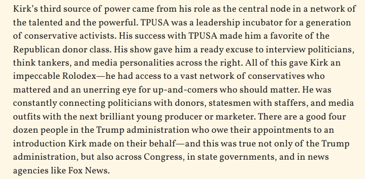 Kirk had four sources of influence: his massive megaphone; his vote-mobilization machine; his personal network of activists, donors, politicians, and media personalities; and the trust of the president.