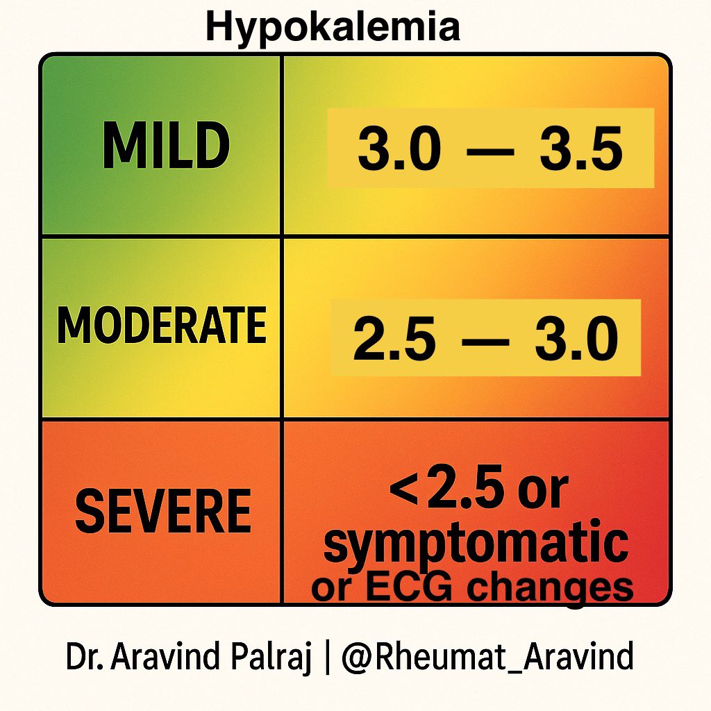 🧵 Hypokalemia – A Clinical Thread plus Rheumatological causes: 1/ Hypokalemia = serum K+ < 3.5 mmol/L.