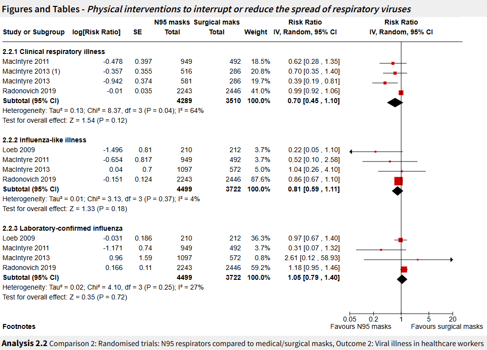 But: For the Cochrane review, cases from studies where the difference surgical vs N95 is strongly diluted are added to cases from well designed studies. One study with strong dilution (Radonovich 2019), but more cases than the other studies, gets the upper hand. 12/