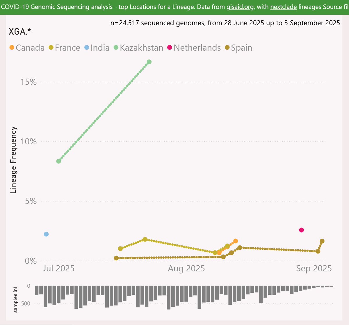 Here's an animated map showing the spread of the XGA variant. The first samples were reported in late June from Pune, India and then Shymkent, Kazakhstan.