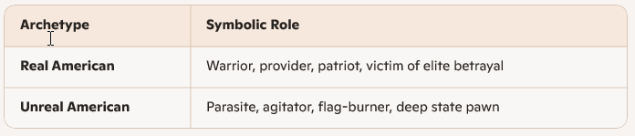 • 🧱 Defines tribal membership: “Real Americans” are framed as hard-working, family-oriented, and economically self-reliant.