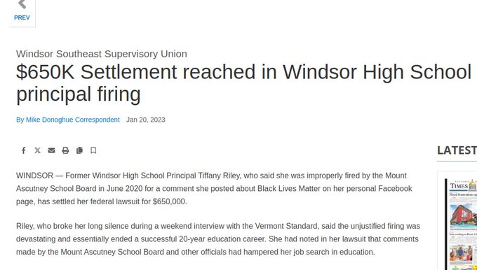 Riley, a Vermont school principal, lost her job for believing that "Black Lives Matter, but questioning some of their methods. Riley wrote: