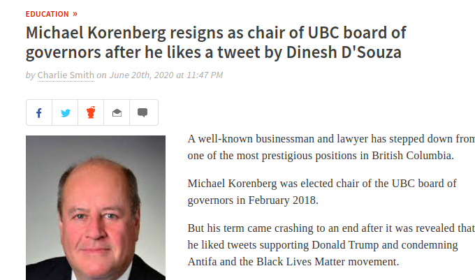 Michael Korenberg lost his position on the board of the University of British Columia for liking a tweet from @DineshDSouza.