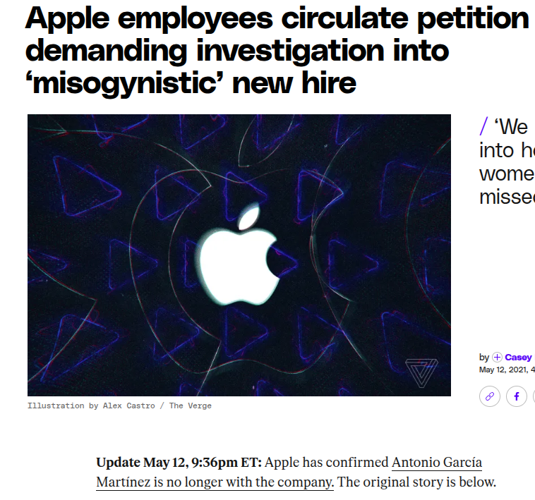 Martínez was fired for Apple for a single paragraph in a book he had written more than five years prior that didn't match progressive gender norms.