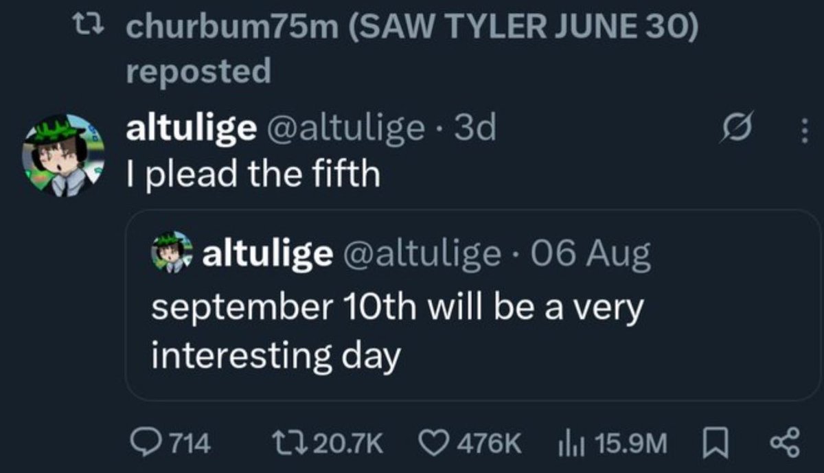 Another account posted on August 6—more than a month before the shooting—that "september 10th will be a very interesting day." After Kirk’s assassination, the account followed up: "I plead the fifth.