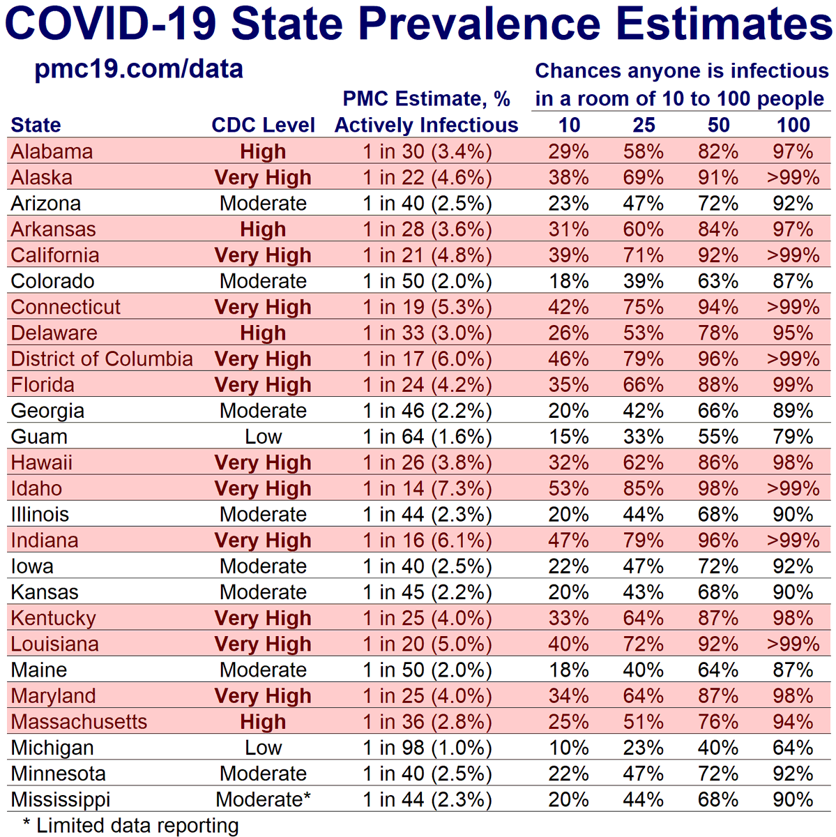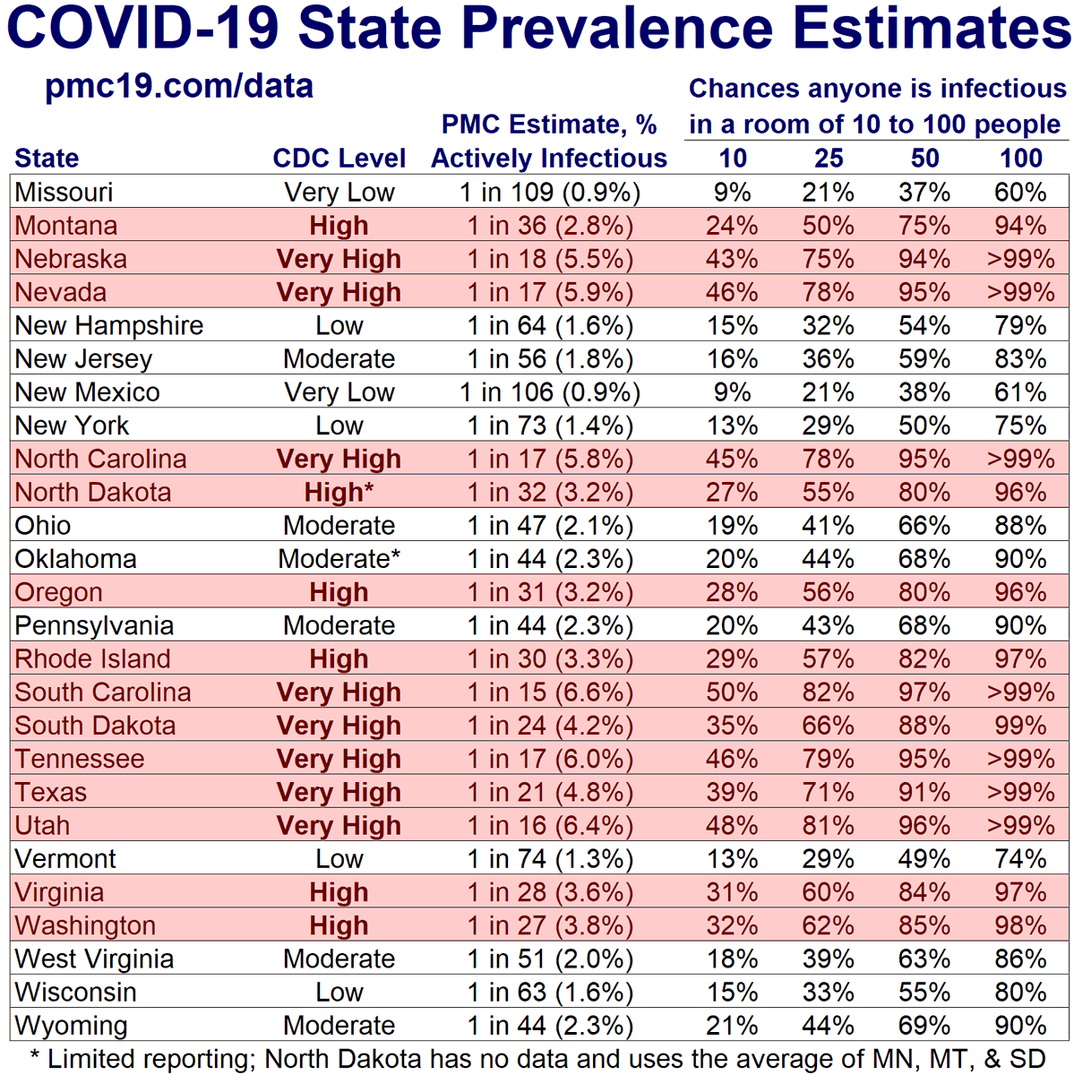 Transmission remains alarming even in areas CDC labels "Very Low" (e.g., Missouri, estimated 1 in 109).