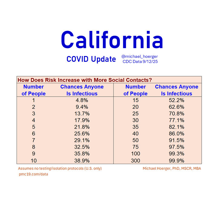 With an estimated 1 in 21 (or 4.8%) of California residents actively infectious of COVlD, risk increases dramatically in larger and more frequent social gatherings.