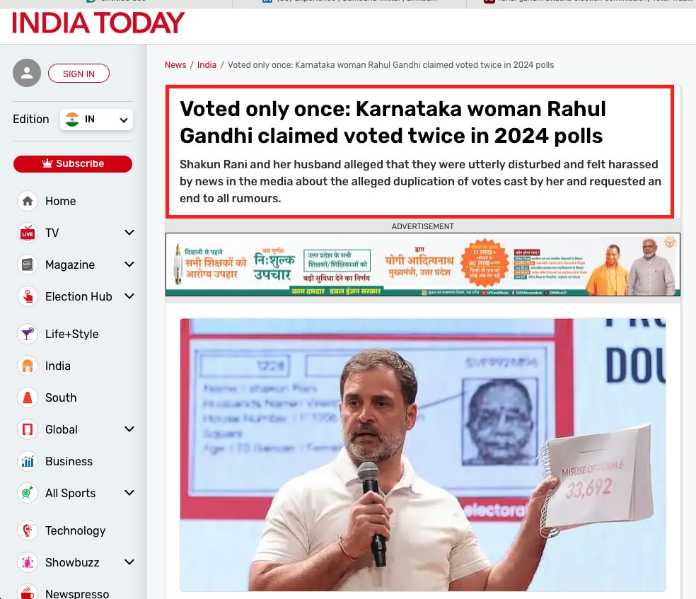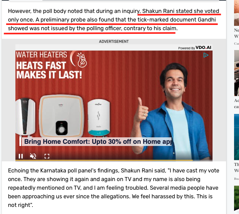 Fact: “Shakun Rani said that she voted only once. A preliminary probe also found that the tick-marked document Gandhi showed was not issued by the polling officer.” India Today.