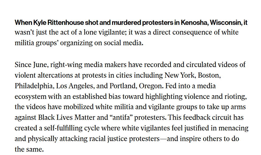 "When Kyle Rittenhouse shot and murdered protesters in Kenosha, Wisconsin, it wasn’t just the act of a lone vigilante; it was a direct consequence of white militia groups’ organizing on social media."