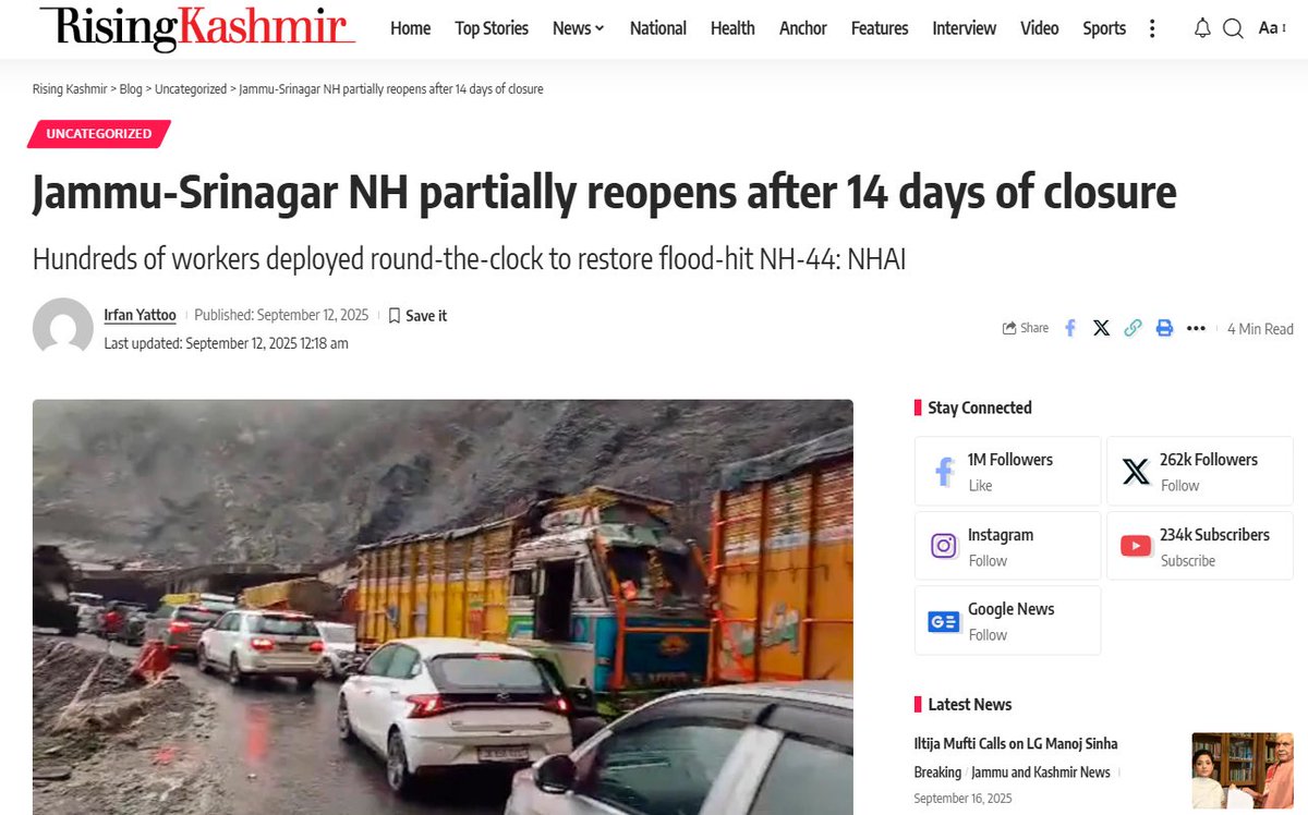 The Jammu–Srinagar NH-44 was blocked due to massive landslides and flash floods—a natural calamity beyond human control.