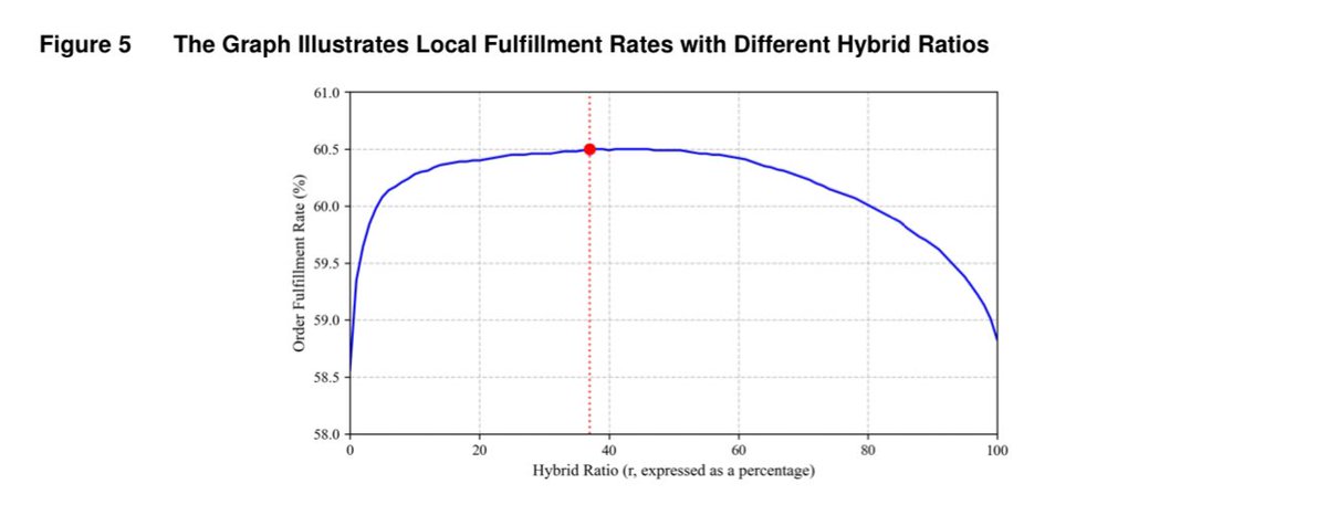 3. The third is a Hybrid approach that blends the two. The Hybrid method performed best, raising local fulfillment rates by about 2.2%. That sounds small, but in $JDs scale it translates into hundreds of thousands of additional orders filled locally.