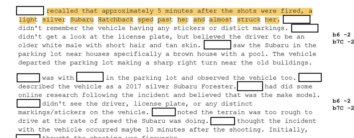 Perhaps even more interestingly, someone told the FBI that they were nearly hit by a car speeding away about 5 minutes after shots were fired.