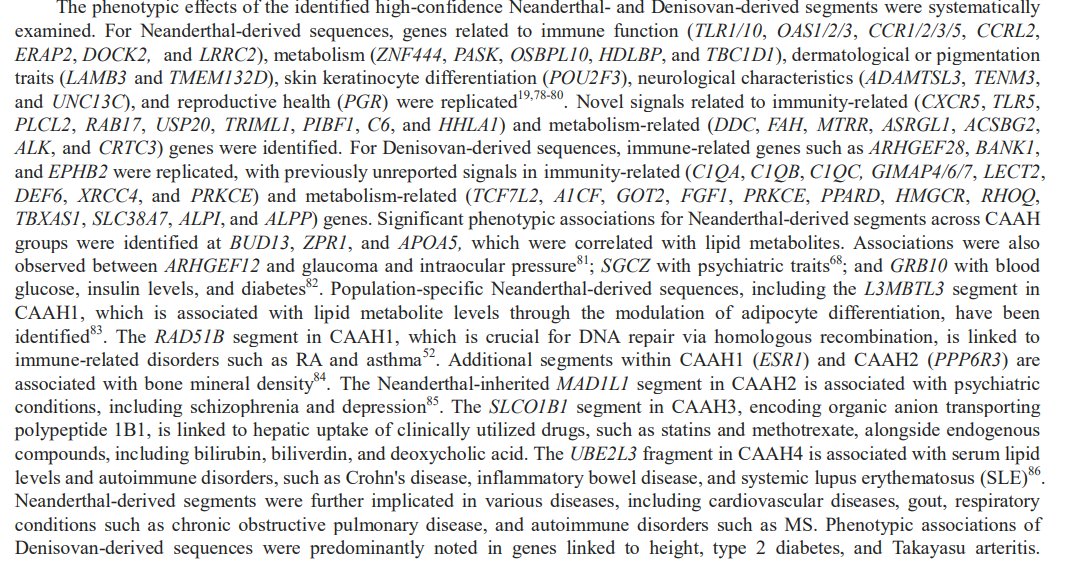 The phenotypic effects of the identified high-confidence Neanderthal- and Denisovan-derived segments were systematically examined.