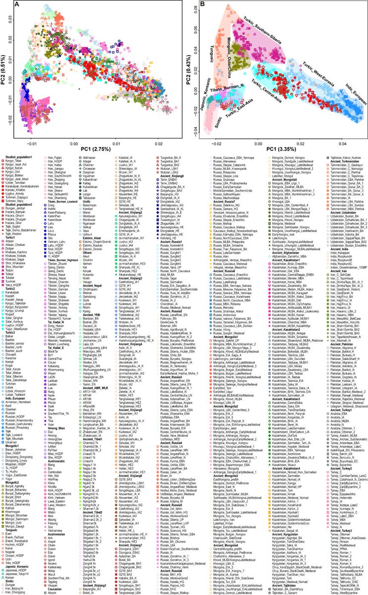 Genetic relationships between newly sequenced CAAH and spatiotemporally diverse Eurasian reference populations revealed based on the merged Human Origins (HO) dataset. (A)