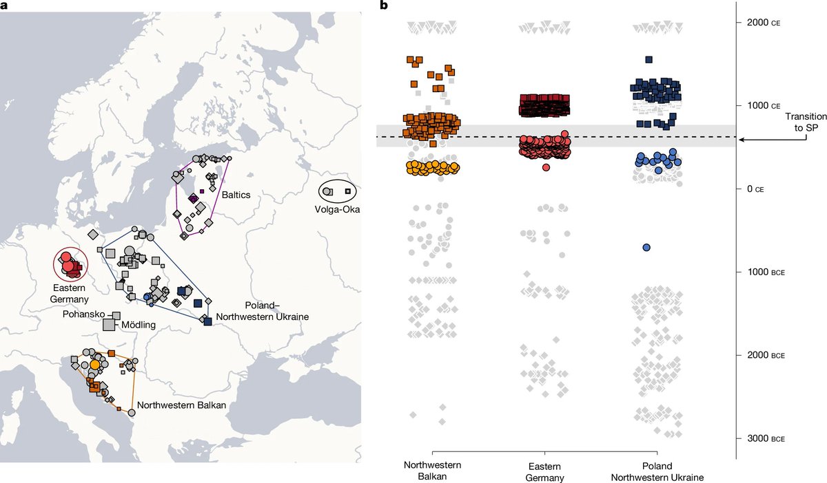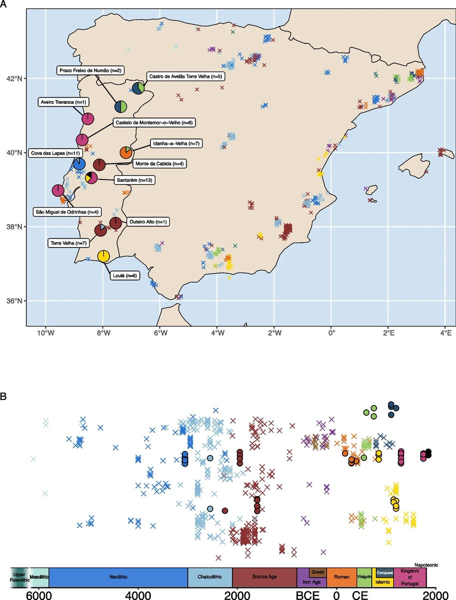 A Geographic and B chronological distribution of newly generated paleogenomic datasets (n = 67; circles) and previously reported paleogenomic datasets (crosses) along a north–south (top to bottom) gradient.