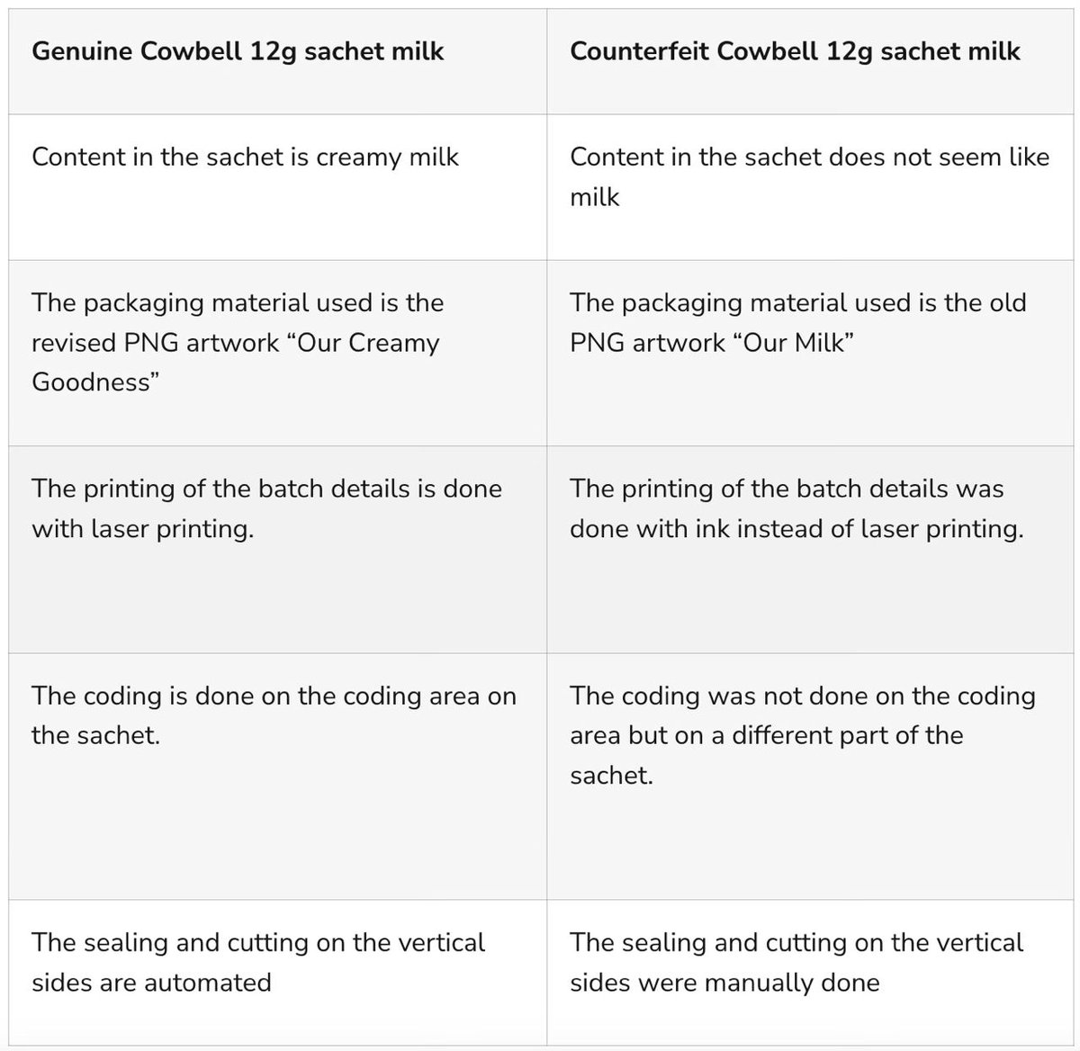 NAFDAC alerts the public to the circulation of counterfeit Cowbell “Our Milk” 12g sachet milk in Nigeria. Promasidor Nigeria Ltd, the Marketing Authorisation Holder of Cowbell, stopped producing Cowbell “Our Milk” in Sept 2023 and replaced it with Cowbell “Our Creamy Goodness”.