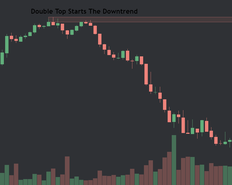 In this example, our downtrend starts with a double top and shows seller strength with a volume surge + strong red candle