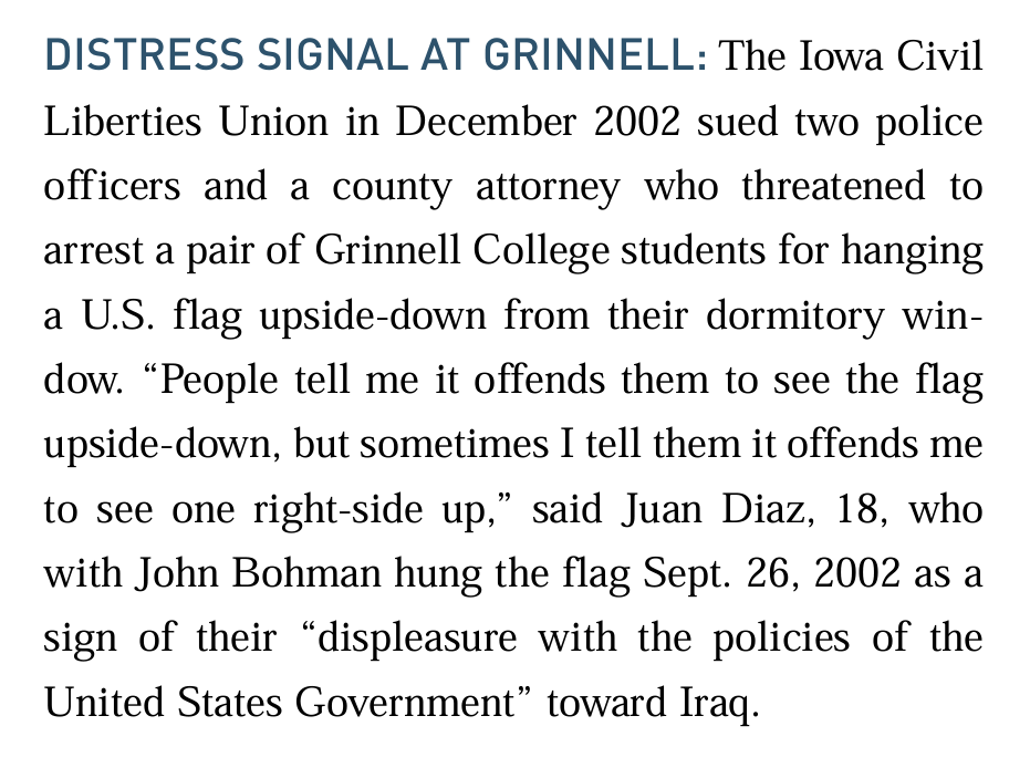 One institution that fought back bitterly was the ACLU, which at that point was the Old ACLU, not the one that progressives took over in the 2010s. Here they noted a case where police threatened to arrest students for hanging a flag upside down to protest the war in Iraq.