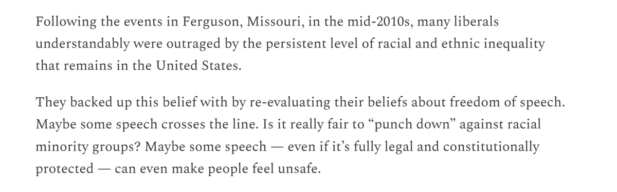 Towards the latter half of the Obama presidency, we saw the Great Awokening. Progressives, incensed by the racial and other inequalities that persisted in America, decided that speech was part of the problem. It can make people not only feel unsafe, but be unsafe.