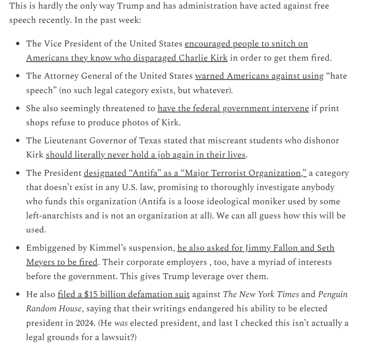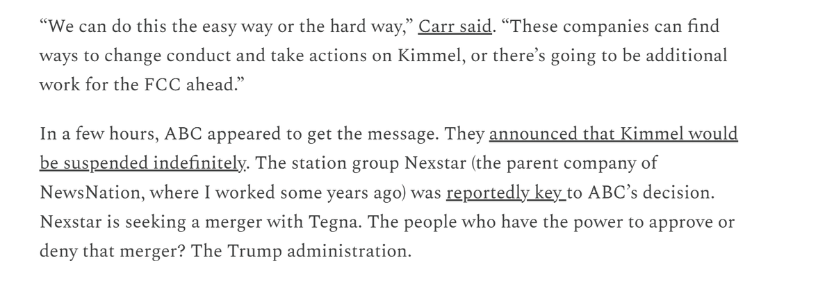 Trump's FCC chair more or less threatened ABC unless they canned Jimmy Kimmel. So they suspended him. Nexstar, one of the parent groups who was starting to remove his show, has a massive merger before the Trump administration's regulators.