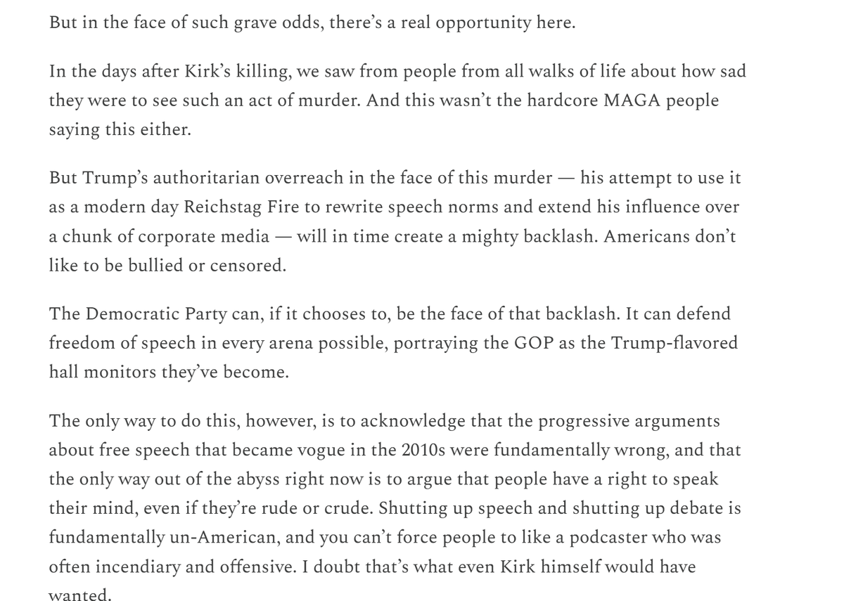It's up to Democrats to decide whether shibboleths created by truly weird people in their progressive branch are more important or preserving 250 years of free speech tradition is more important. Trump doesn't give a damn about free speech. But hopefully someone else does.
