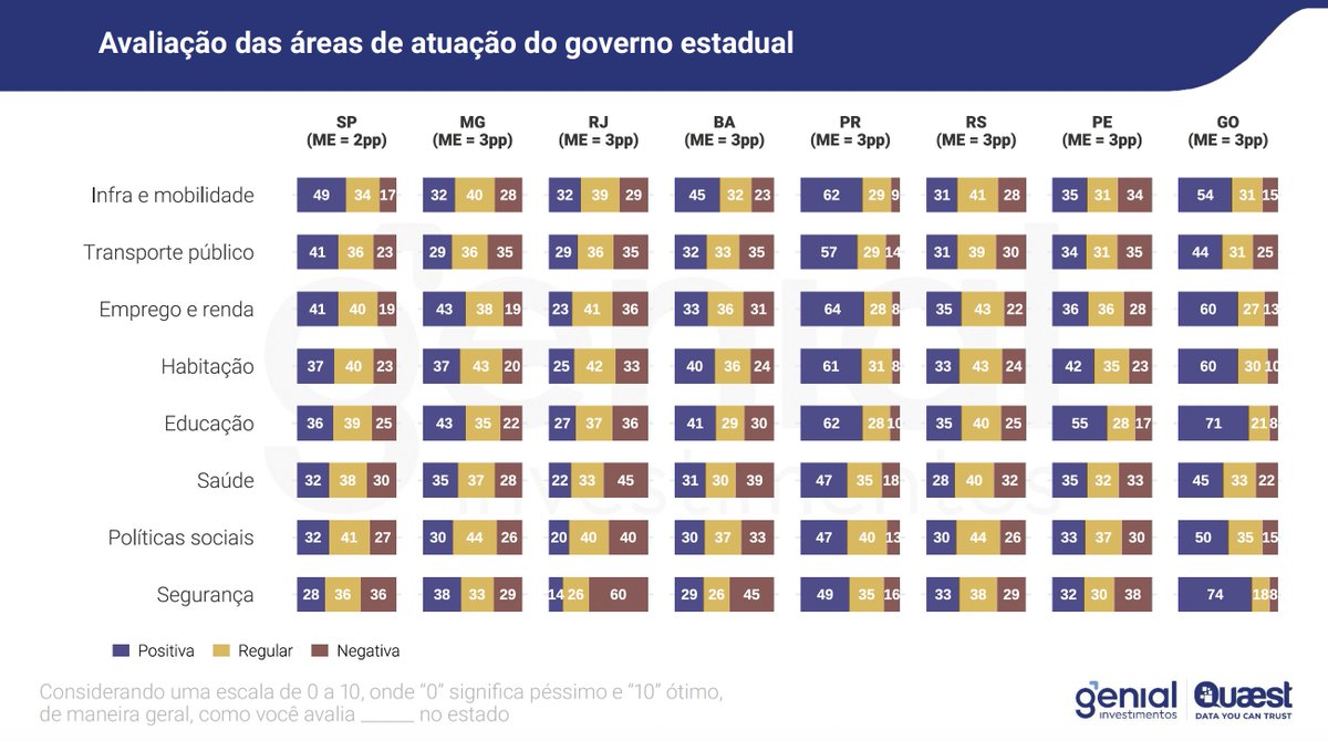 3/ Governadores mais bem avaliados também são aqueles que tem políticas aprovadas. Em Goias, segurança e educação tem mais de 70% de avaliação positiva. No Paraná e em São Paulo, emprego, renda e infra-estrutura aparecem em destaque.
