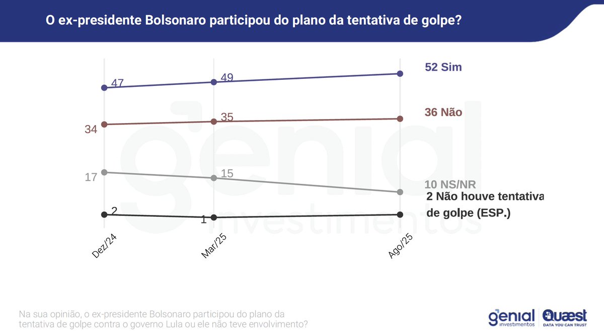 3/ A avaliação de que a prisão domiciliar foi justa vem associada a um outro fato: 52% acreditam que Bolsonaro participou de um plano de tentativa de golpe, enquanto 36% afirmam que não. O curioso é perceber como ao longo do tempo esses dois lados foram se consolidando.