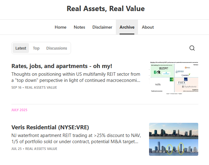$VRE: NJ waterfront apartment REIT trading at >25% discount to NAV, 1/5 of portfolio sold or under contract, potential M&A target.