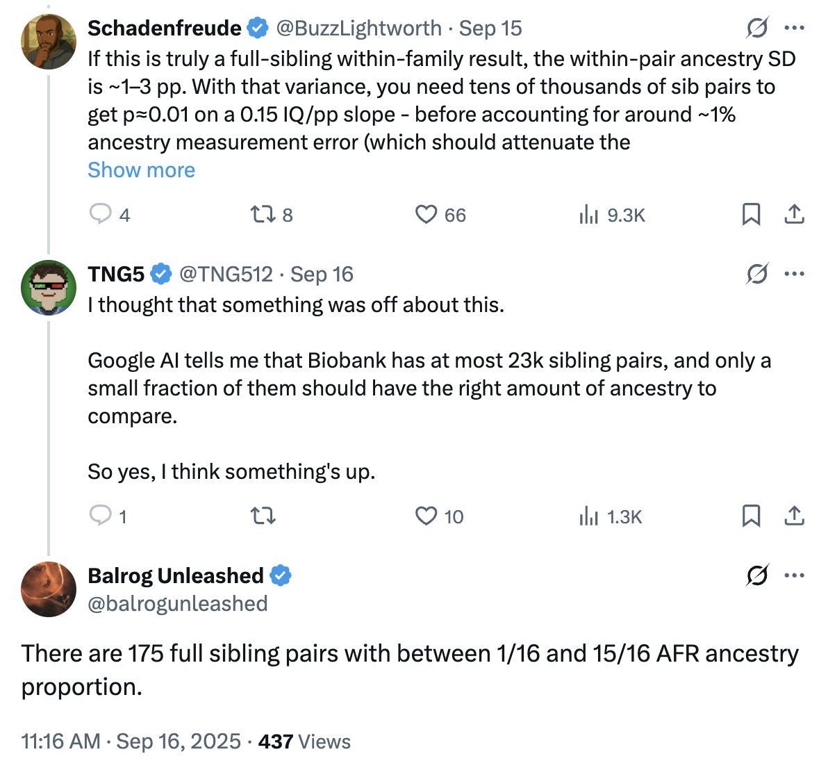 What's actually going on? Some guy claims to have an analysis showing that African ancestry differences between siblings are associated with IQ differences in the UK Biobank. Implying an ancestry difference in the within-family influences.