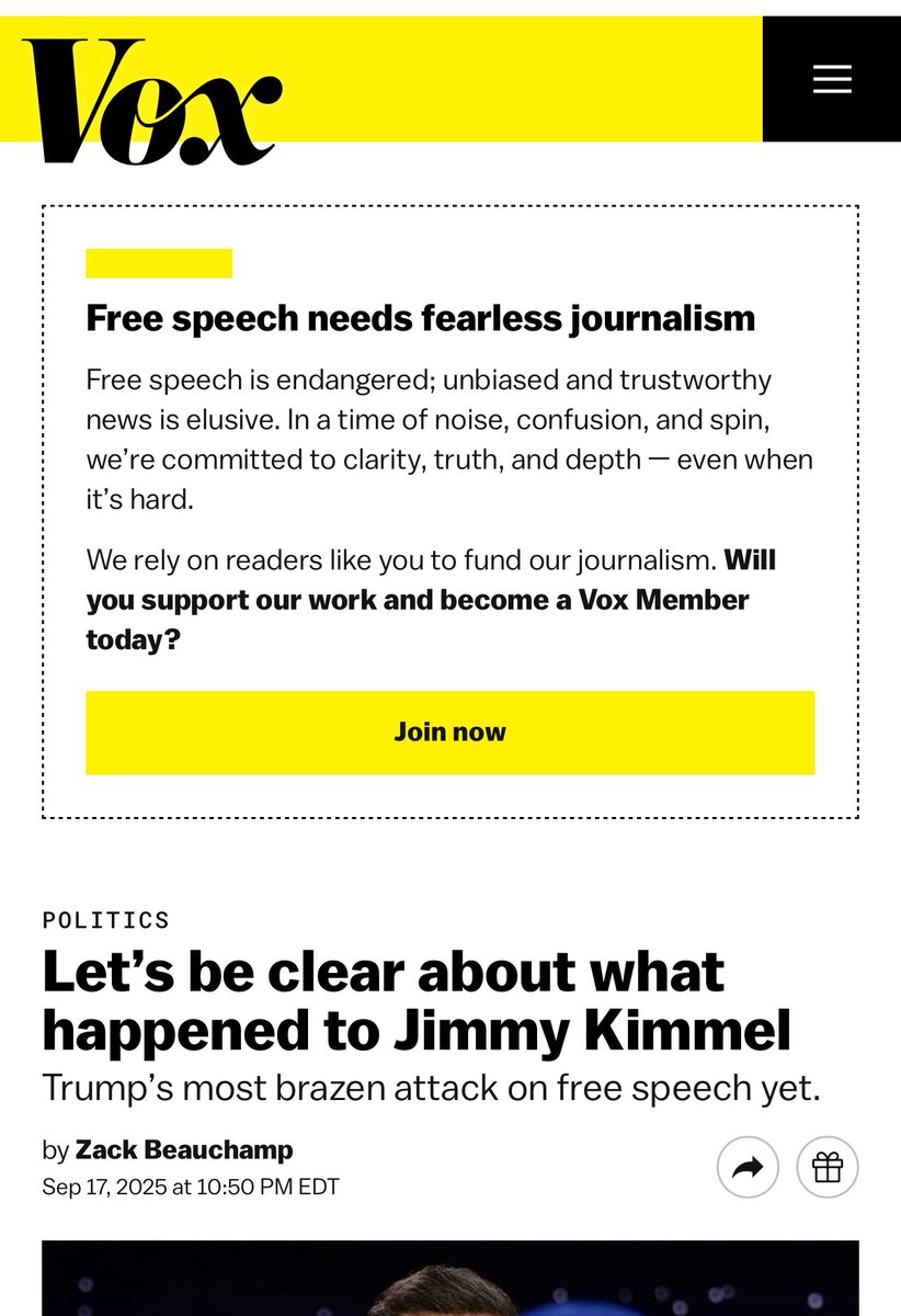 Kimmel going off the air is a “brazen attack on free speech,” but objections to actual moves to curtail free speech are a dereliction of a court’s responsibility. @voxdotcom