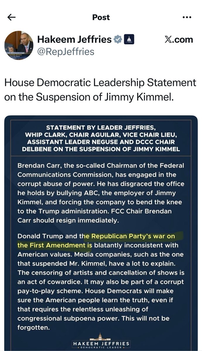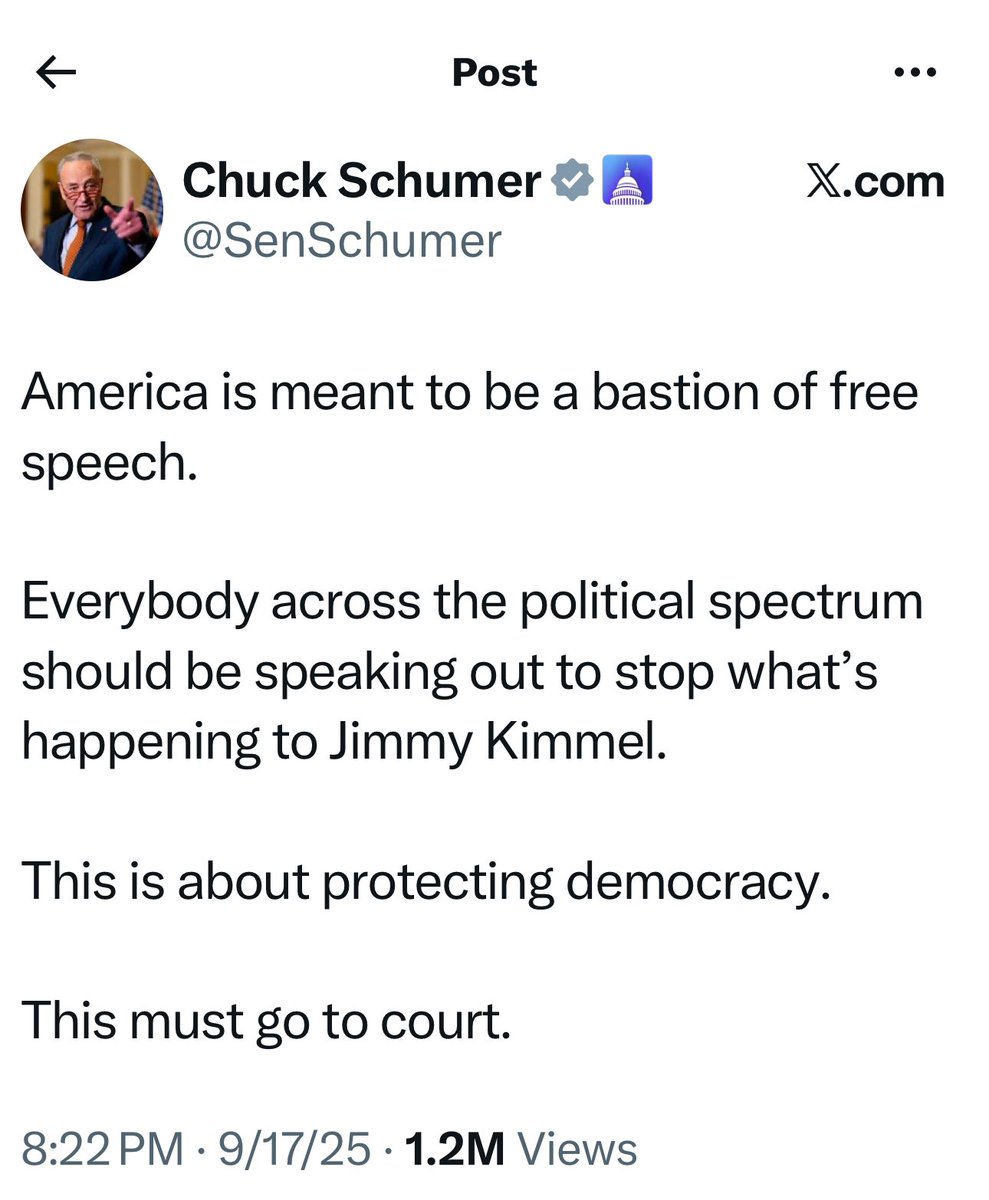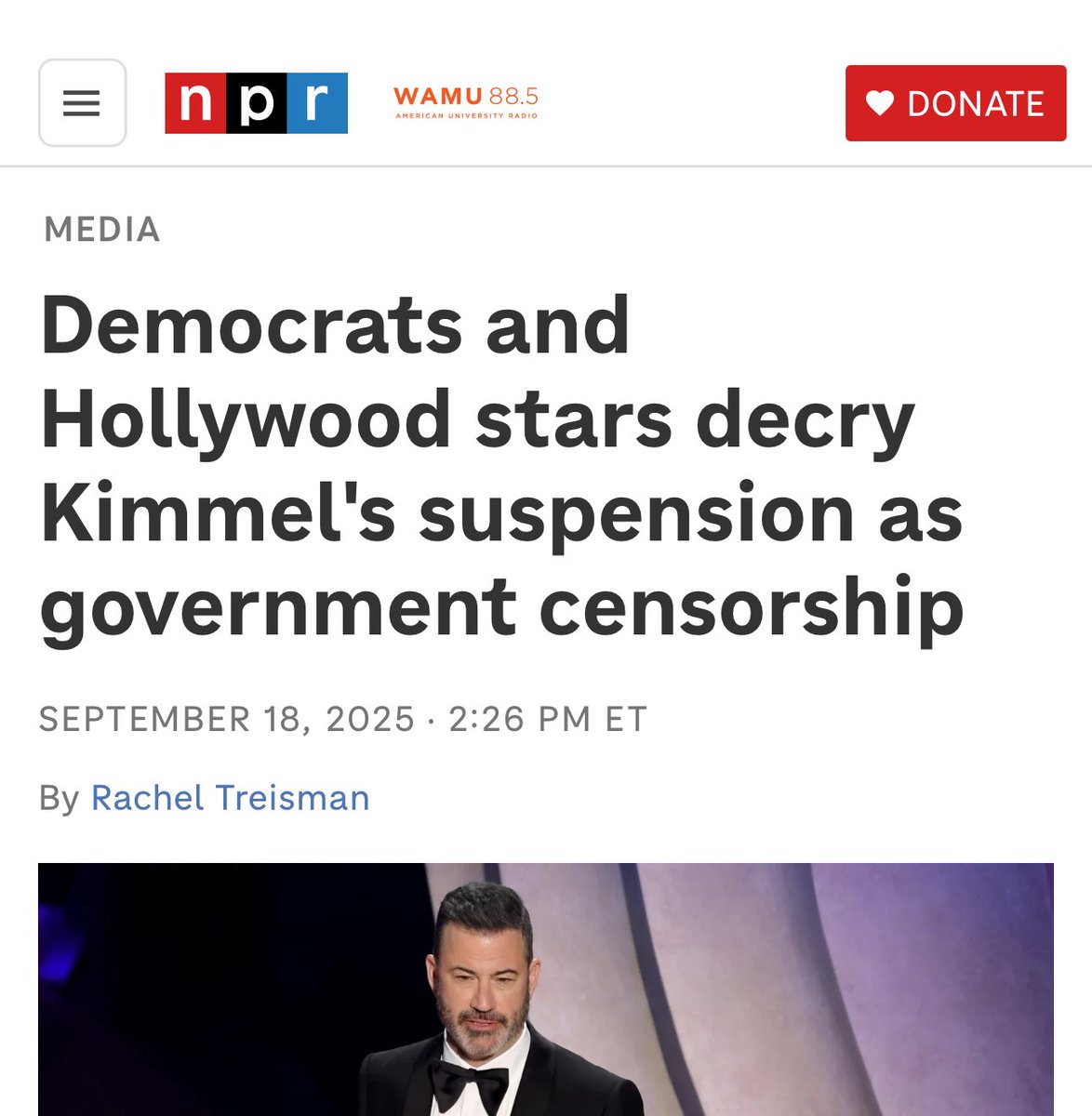 Maybe the funniest about-face comes from @NPR, who like Hollywood and Democrats are up in arms about the “government censorship on Kimmel’s firing.