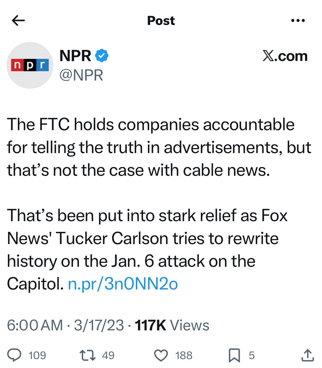 Back in 2023, NPR was instead upset that government *wasn’t* policing speech from cable news.