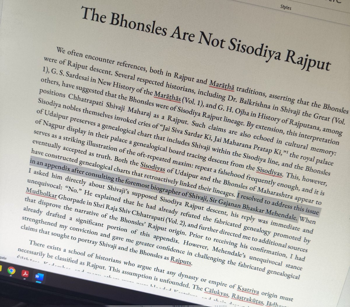 I wrote an appendix on Shivaji’s lineage titled “Bhonsles Are Not Sisodiya Rajputs”. It was about halfway done, nearly 40-50% complete, and Shri Gajanan B. Mehendale had already approved it.