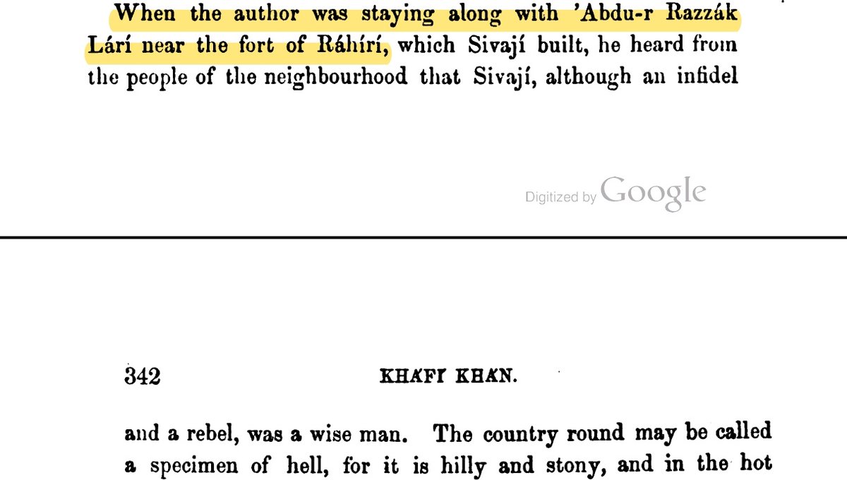 Khafi Khan asserts that while he, referring to himself as the author, was staying with Abdu-r Razzak Lari near Raigad, he heard this report and clearly identified himself as a hearsay source.