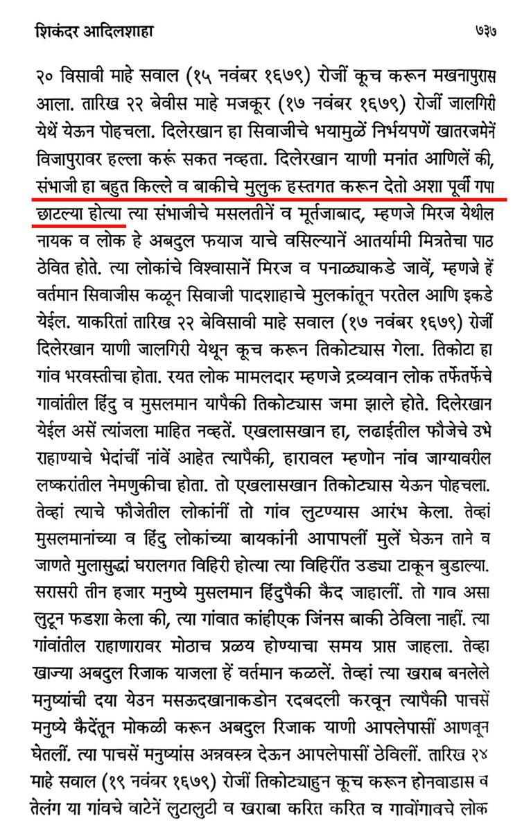 The Adilshahi source, Basatin-us-Salatin, explicitly indicates that Shambhuji made false promises to Dilir Khan regarding the acquisition of Maratha territory and forts. 🧵-