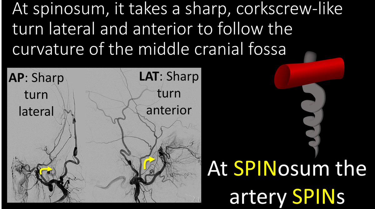 This gives it a very characteristic angiographic appearance—always look for the sharp turn. I remember that the artery SPINs after SPINosum
