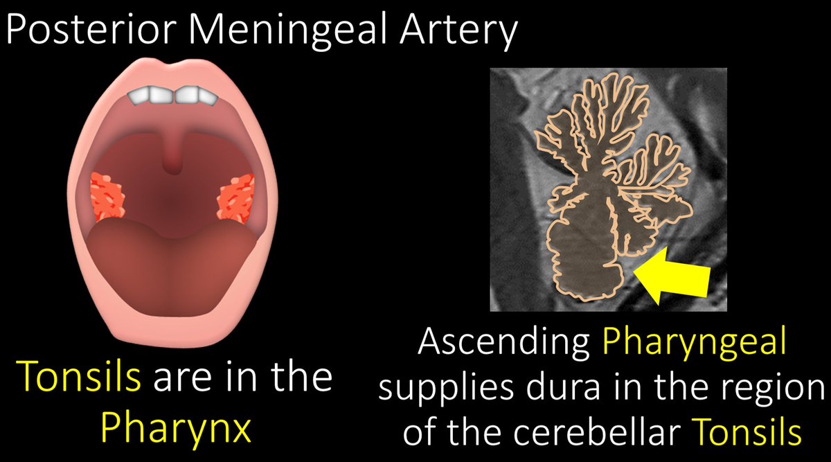 13/You can remember its origin bc TONSILS are in the PHARYNX, so the ascending PHARYNGEAL supplies the dural around the cerebellar TONSILS (posterior fossa)