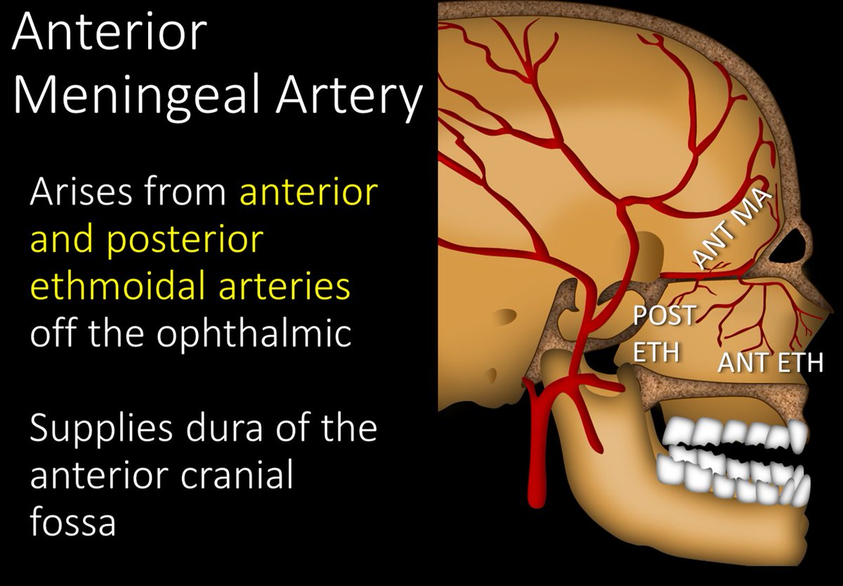 14/Anterior meningeal artery is also much smaller than the MMA. It arises from both the anterior and posterior ethmoidal arteries
